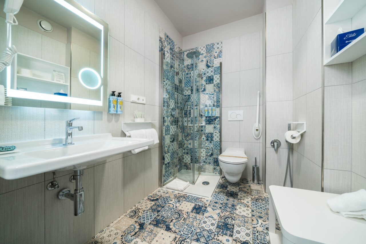 Pavimento in piastre si cemento, Balcone vista strada / laterale, Wi-Fi, Bollitore con té e caffè, frigo bar, TV, Bagno con vasca, Set di cortesia, asciugacapelli.
