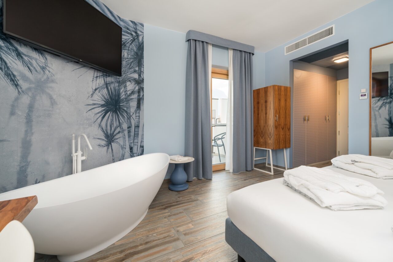 Pavimento con piastre in cemento, Vasca Freestanding in camera e doccia in bagno, Balcone vista strada / laterale, Wi-Fi, Bollitore con té e caffè, frigo bar, TV, Bagno con doccia, Set di cortesia, asciugacapelli.