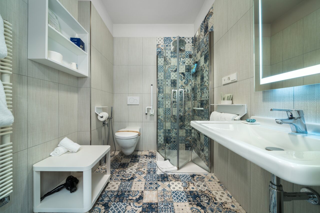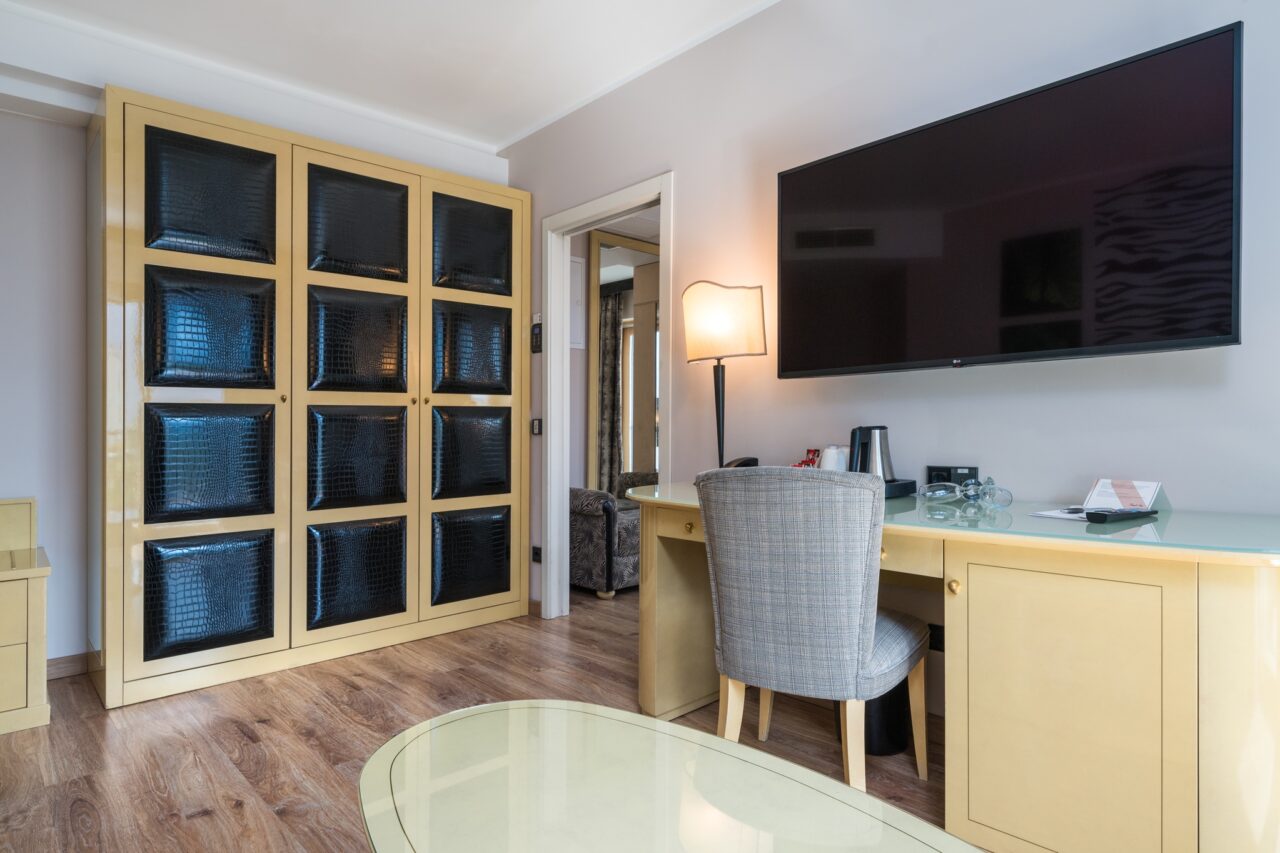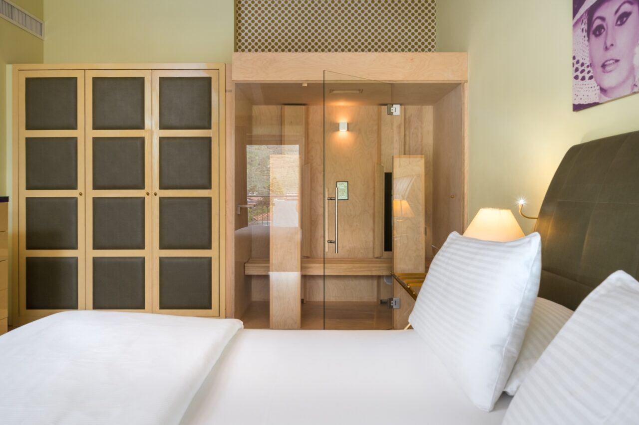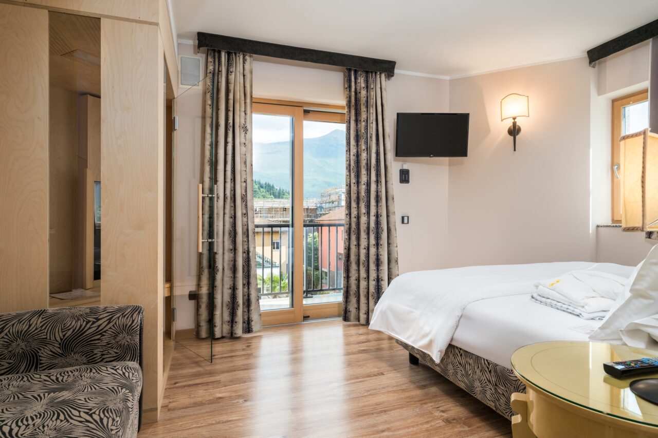 Suite moderna con soggiorno e camera da letto separati, nei toni del beige, marrone e nero. Alcune con terrazzo altre con 2 balconi. Bagno con doccia, sauna ad infrarossi in camera.