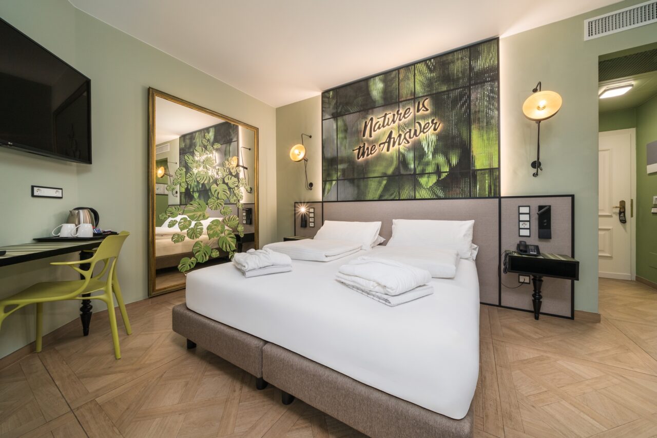 Camera nuova dal design innovativo sui toni del azzurro e rosa, con materiali pregiati come il legno l’olivo abbinati ad uno stile new retro’, luci accattivanti, grande televisore LG, balcone, bagno con doccia e alcune senza Bidet, 18/20 metri quadri, vista parcheggio e strada. Letto matrimoniale formato con due materassi singoli legati insieme.