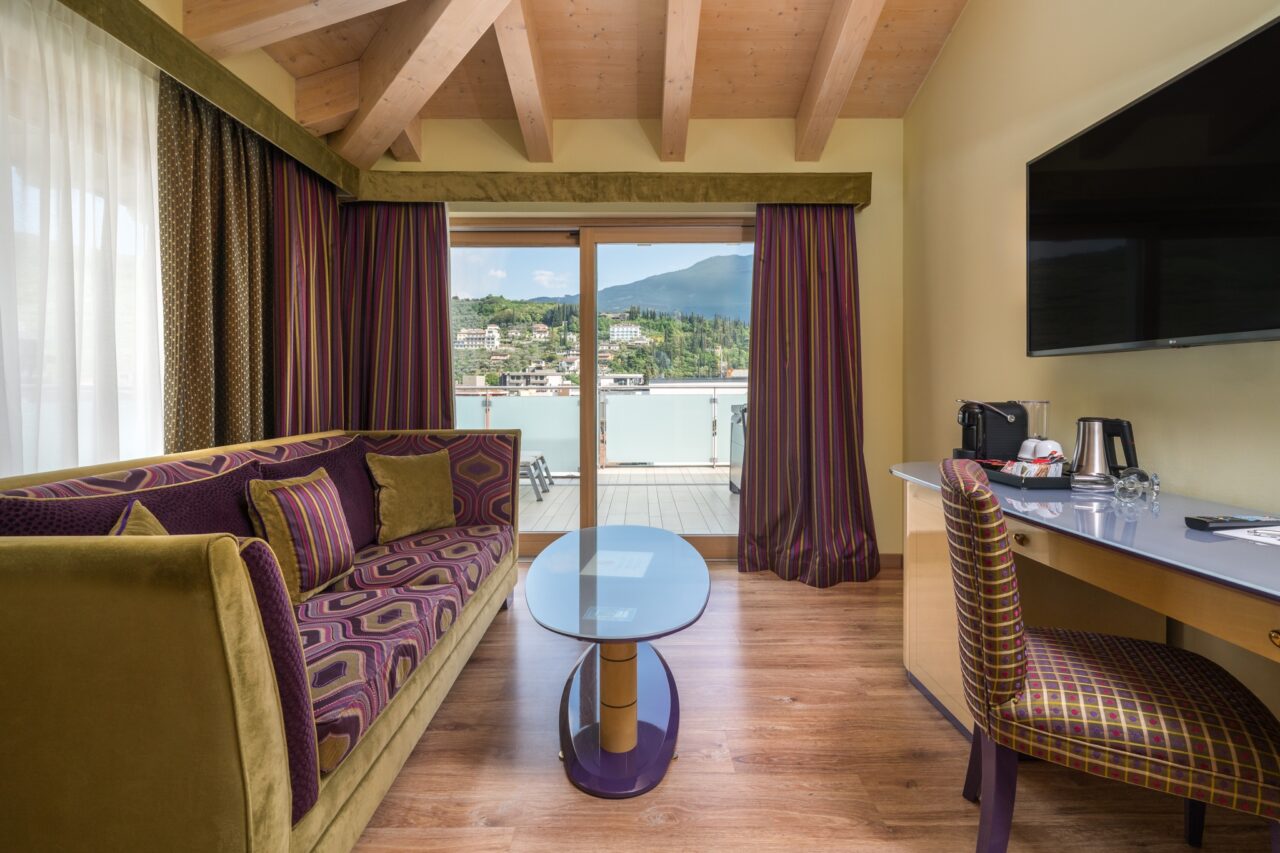 Suite giovane e trendy, nei toni del verde e viola. Letto matrimoniale con materasso matrimoniale di 180×200 cm. Dispone di una grande terrazza con vista lago verso Nord-Est su cui è posta una vasca idromassaggio riscaldata a 30° per 4 persone. In camera da letto una Sauna ad infrarossi. Bagno con doccia.