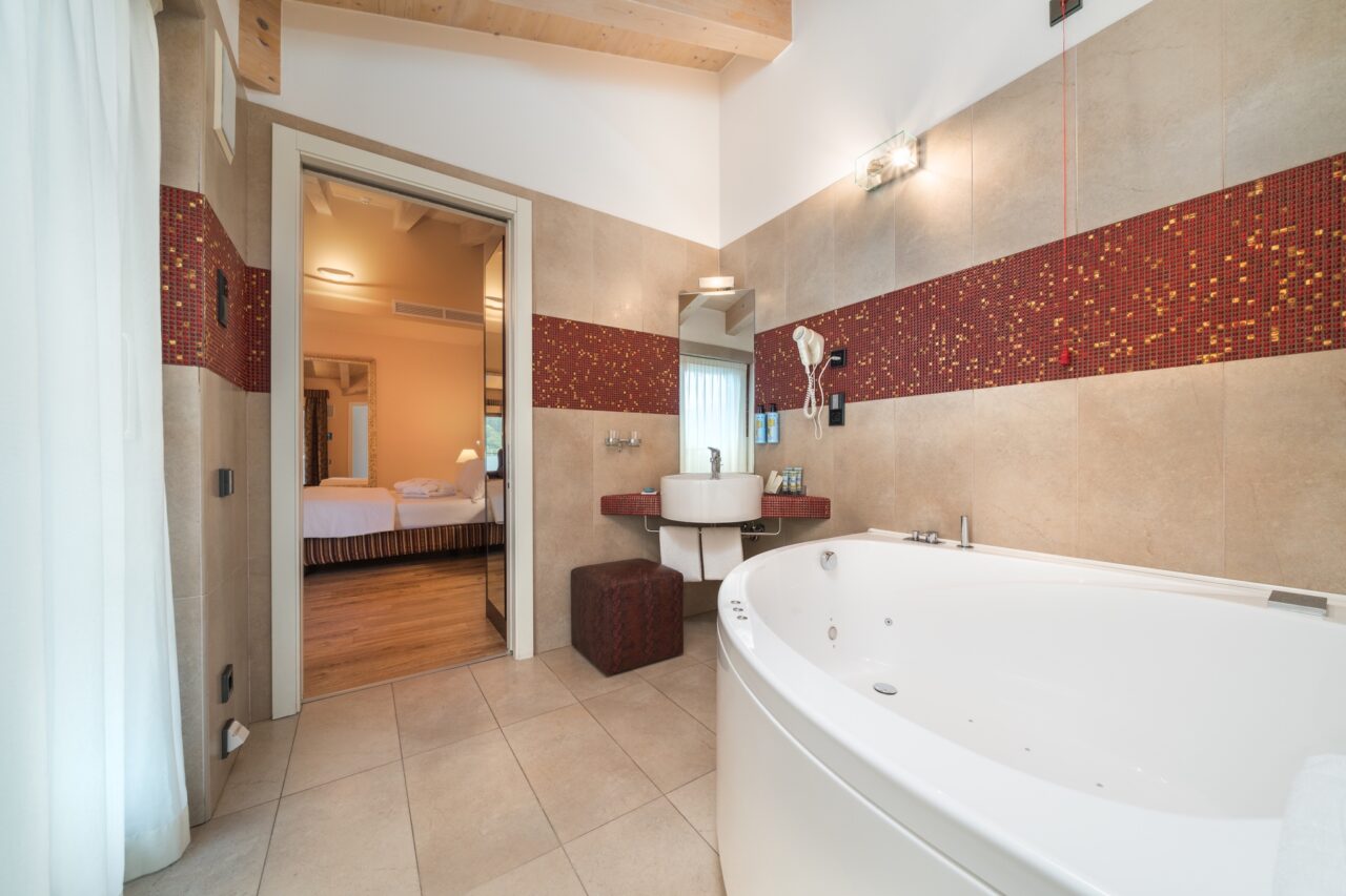 Pavimento con parquet, Bagno turco, cromoterapia e doccia emozionale, Vasca idromassaggio rotonda per 2 persone, Letto king size (200 x 180 cm), Cabina armadio, Terrazzo Vista lago e giardino, Wi-Fi, Bollitore con té e caffè, frigo bar, TV, Set di cortesia, asciugacapelli.