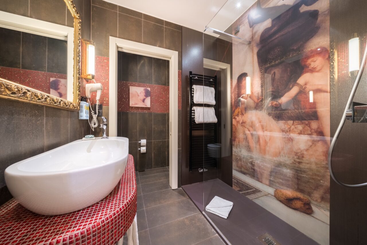 Suite esclusive e lussuose di circa 60mq, ispirate agli elementi Acqua o Terra, con splendida terrazza di 40mq. Dispongono di vasca idromassaggio (interna) rotonda per due persone, bagno turco con doccia emozionale, cromoterapia, letto “king size” (200 x 180cm), cabina armadio, soppalco attrezzato con divano letto.